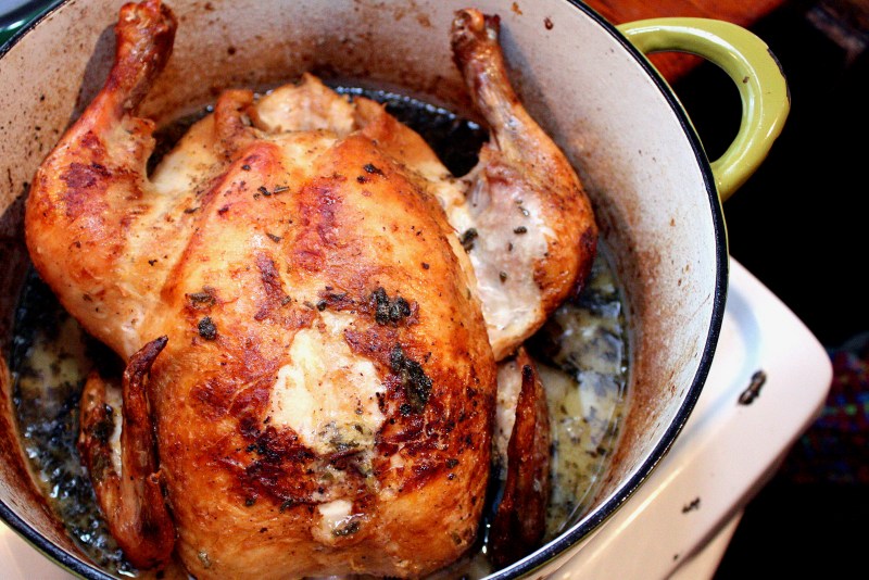 - Brown chicken skin. In a Dutch oven or covered casserole that will fit the chicken snugly, heat butter and olive oil over medium-high heat until butter has frothed and oil is shimmering. Add chicken and brown skin on all sides until nicely golden (I find using two sturdy wooden spatulas the easiest way of turning the chicken in the pot; tongs just rip the skin) about 3-4 minutes/side. Transfer chicken to a clean plate; pour off melted fat & juices, reserving in a heat-safe bowl (I use the fat to flavor mashed potatoes and to sauté the greens that accompany the chicken). Be patient with this step: it really helps to develop flavor in the finished dish.