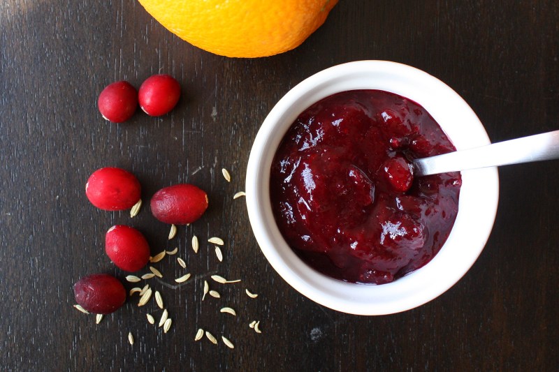 Cranberry sauce may just be the easiest condiment to make, ever. I really don’t know why anyone would buy it; not only is it so easy to make, it is so easy to customize to exactly the flavor & texture you want. Cranberries contain a lot of natural pectin, so the sauce naturally thickens without a lot of sugar or thickeners such as cornstarch, flour or gelatin. The cranberry’s tart flavor plays nicely with a wide variety of flavor profiles: some people prefer the warm, winter flavors, like port wine, cinnamon & nutmeg; orange & cranberry is a classic, while cranberries with rosemary & juniper is an earthy, modern twist; I love cranberries with chile peppers and ginger, but my version below combines orange, white wine and fennel. However you like them, there’s no denying the cranberry sauce is quick, easy & delicious: why not make some today?