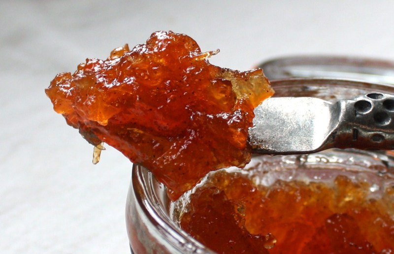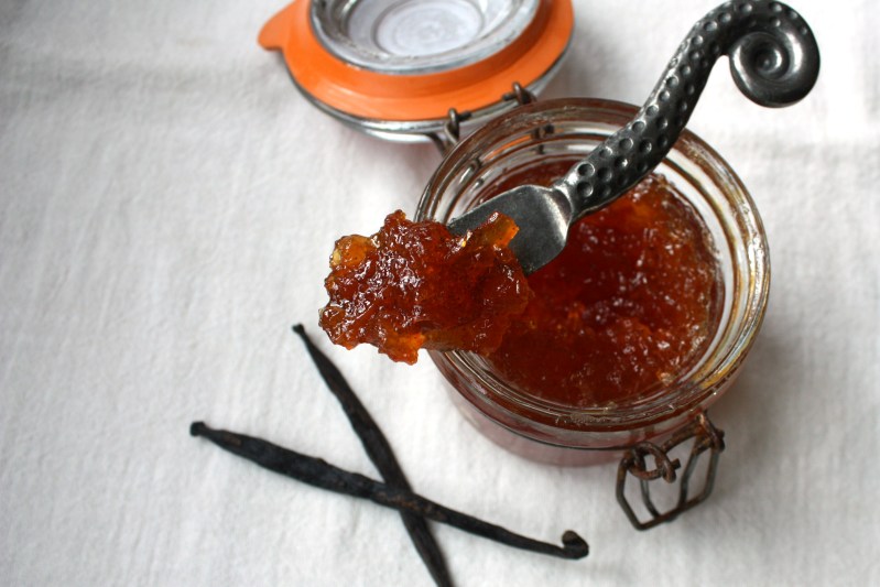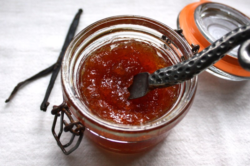5. Add 1 or 2 pieces of vanilla bean to each hot, sterilized jar, then ladle hot marmalade into jars to ¼-inch headspace. Remove air bubbles, wipe rims, affix lids and process in a boiling water bath for 10 minutes.