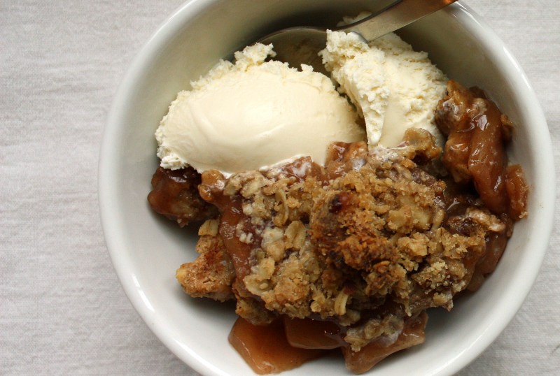 Sometimes I am lazy. Often, especially in late winter it seems, I just can’t work up the motivation to put together a fancy dessert, or even to roll out a pie crust (I blame the lack of Vitamin D). But, even in winter, friends come to visit, or Tai works a week of 15-hour days back-to-back and I can’t just crack open a box of Entenmann’s and say “Here you go, kids!” It’s just not my style. But I can do the next best thing: canned apple pie filling, a no-muss, no-fuss melted butter crumble topping and 30 minutes in the oven, et voila! Dessert. Or, as I like to call it: locavore fast food.