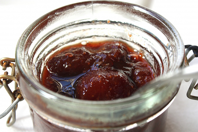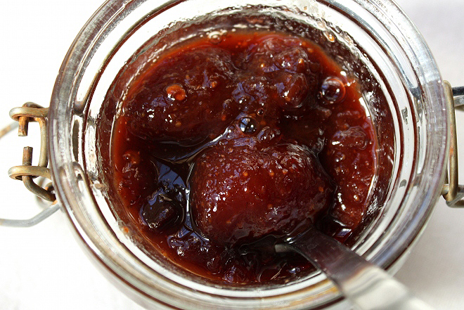 You know, Tigress, I remembered your post on the shrunken-head Ferber technique, but I didn’t remember seeing the strawberry-chipotle post. But I’m thinking I must have, back when you posted it, because I originally named this “smokin’ strawberry chipotle preserves,” complete with the “n’.” Great minds…. 🙂