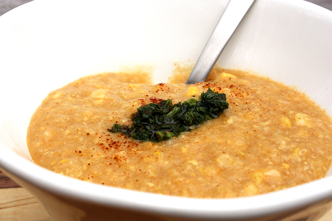 1. As mentioned above, I think a vegetarian or vegan version would be quite tasty. Flavorful stock is a must, however; I’ve made this with commercial stock (Better Than Bouillon) and it wasn’t nearly as good as the version made with my homemade chicken stock. Use vegetable stock and replace bacon grease with butter or olive oil; for a vegan version, omit cream in the corn meal slurry, or replace with soy or rice milk.