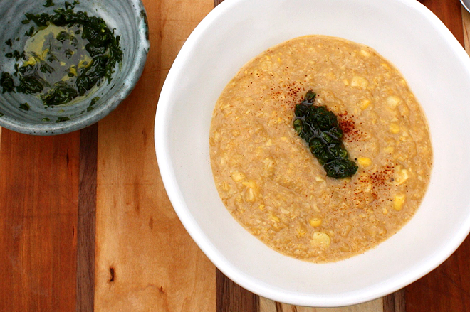 3. I really liked this garnished with cilantro; I took a frozen cilantro cube from last summer, thawed and mixed with a bit of olive oil, then dolloped that on the soup. The brightness of cilantro alongside sweet corn just screamed summer. Which is a wonderful thing just now.