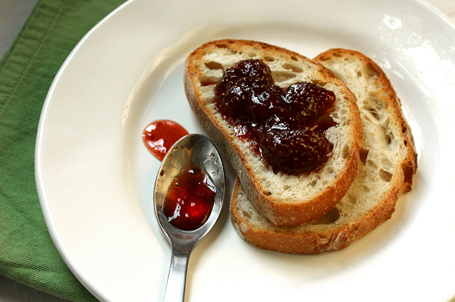 I don’t know if I can extend the concept of terroir to include Connecticut strawberries and Pennsylvania pinot noir, but all I can say is that this preserve is something special. I’m glad I didn’t include the spices: the flavor of the wine shines through, but is in perfect complement to the strawberries, and the flavor profile is amazingly complex considering there are only two main ingredients. Although I cut down on the sugar (as I always do with a Ferber recipe), I included a bit more than I normally would; firstly, because I increased the amount of wine, and secondly, because strawberries have very little natural pectin, and I knew they would need some help in achieving a set. The resulting flavor is still just a bit too sweet for me, but the set is a dream: absolutely perfect. I think with some tweaking of lemon juice & sugar, I could be onto something here.