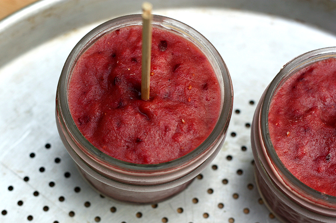 I don’t have popsicle molds, nor Dixie cups, nor a craft-cabinet stocked with disposable popsicle sticks (nor kids: coincidence?). What I do have is lots & lots of Ball jars: the tiny quarter-pint size seemed perfect for popsicles. I cut the sharp tips off the ends of a few bamboo appetizer skewers, whipped up popsicle pulp in the Cuisinart, and a few hours later: dinner. I’m off to enjoy another one now, and to root on the US as they (hopefully) spank the shin guards off of our neighbors to the North.