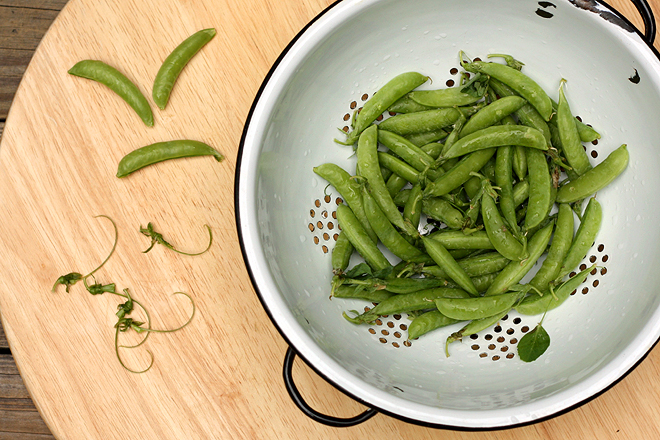 - 1/2 lb sugar snap peas, rinsed, stem ends snapped off and center string peeled