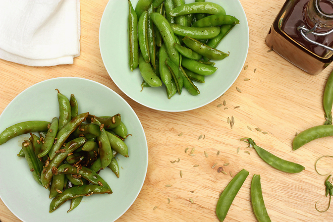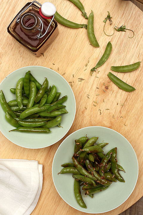 I can see this working with many a fruit syrup and/or “failed” jelly or jam: add spices, dried chiles, fresh herbs or seeds, according to your taste, larder and fancy. Whatever you do, don’t miss sugar snap peas at the market: they grow up so fast. Sigh.