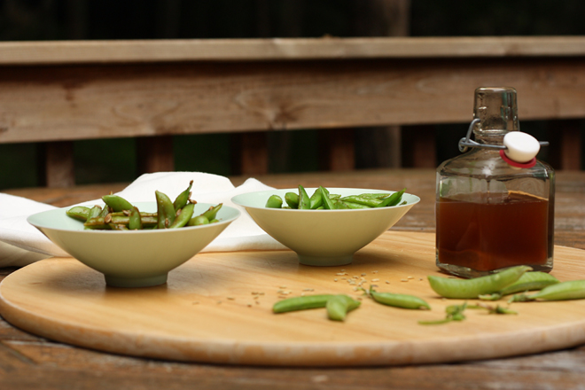 I picked up about a pound of sugar snap peas from Migliorelli Farm at my farmer’s market on Saturday. Sugar snaps are one of my favorite Spring vegetables: coming in right at the tail end of asparagus season, their fresh, green sweetness consoles you for the loss of the wonderful ‘sperge, while satisfying the crisp & crunchy craving before carrots and cucumbers show up in abundance. Sugar snaps are so sweet and delicious that, around here, we’ll eat them raw like candy; but they are also nice gently warmed and glazed with any manner of sweet or sour, fruity or tangy concoction.