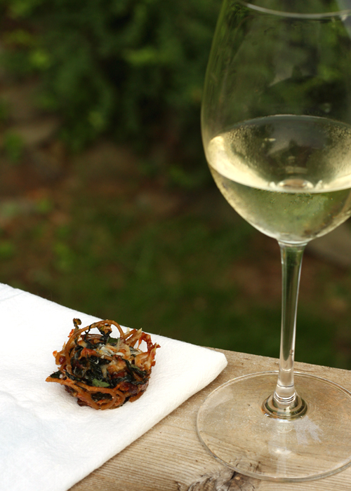 Interestingly enough, while I am thrilled with how the recipe turned out (I had to stop myself after I’d eaten 10 of them, because the whole “but they’re so tiny!” excuse only works for so long), I’m not so thrilled with the photograph, the whole purpose of the recipe in the first place. Isn’t that always the way? I had a feeling in my head that I wanted to capture with the photos when I was shooting and it just wasn’t working: I took frame after frame and couldn’t put my finger on why I wasn’t happy. I finally realized that what I really wanted was to photograph this bite-sized party food at a party: in a real-life setting with friends, food, wine, laughter. Unfortunately, the deadline appoacheth, and I couldn’t whip up a spur of the moment Spaghetti Nest Party (you laugh – stranger parties have been dreamt up here, believe me) since Tai was in the Adirondacks and I was in Boston, so I had to make do. Just do me a favor? Close your eyes. Now, imagine a party going on in the background: festive music, glasses clinking, people talking, maybe a fire on the deck, and lots of om-nom-good noises. Got it? Good –now open your eyes. Isn’t that better? If only I can convince everyone in the photography contest to do the same thing.