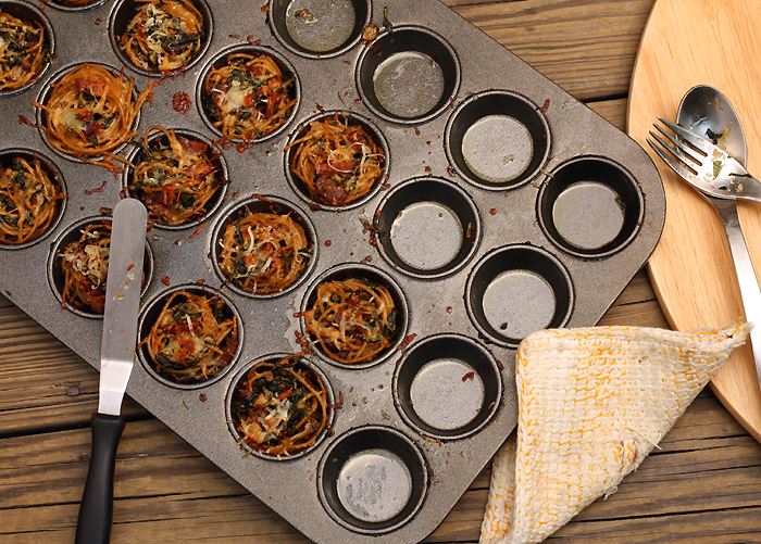 - Lightly spray a mini-muffin pan (or two, if you have them) with oil. Twirl spaghetti around a fork into the bowl of a soup spoon; slide off the fork into each muffin cup, tucking stray strands into a nest shape. Top each nest with a bit of bacon and grated cheese.