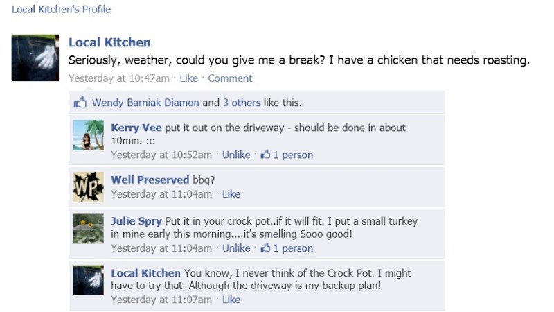 Unless I can manage to get myself out of bed before 6:00 am (a rare feat on the best of days), it’s far too hot to turn on the oven. Far too hot, especially, to turn on the oven to roast a chicken: yet that is exactly what I needed to do. In the cooler days of last weekend, I had pullled a whole chicken out of the freezer to thaw, intending to roast it on Saturday for dinner. But by Saturday night it was not fully thawed, and I was busy making soba noodles and frittata for a World Cup Final viewing party. By yesterday, that chicken had been in the fridge for more than three days: it needed cooking, and it wasn’t going to outlast this heatwave. But the thought of cranking the oven up to 400 degrees for over an hour? <shudder> No thanks. I thought about chopping it up and putting it on the grill, but my deck gets full Southwestern sun all afternoon: it was hot enough to fry an egg out there. I thought about attempting to butterfly the chicken and going the faster, broiling, route: but my knife skills are legendarily poor and firing up the oven to 550 degrees for “only” 30 minutes didn’t seem like a great alternative. Enter Facebook.
