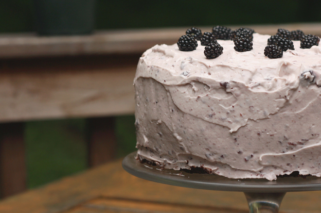 Nearly every year, I make at least two birthday cakes: one is for my friend Kami, a practically-grown-up girl of seven this April, and one is for Kami’s mother Nadine, who as of last weekend was old enough to have a seven year-old daughter but young enough to squeal with glee at the thought of birthday cake. I’ve had my trials (who can forget the Great Kami’s Birthday Cake Debacle of ’09) and my successes (the orange mousseline buttercream cake turned out particularly lovely) but for the most part, it’s a bit unpredictable: the weather plays a big role, especially for Nadine’s late July birthday; I don’t use white flour (substituting local Wild Hive whole wheat pastry flour instead) so the behavior of my flour can change year to year; and I always seem to be making up frostings & fillings on the fly. With a backlog of cooking piling up in my post-hotpocalype kitchen, Nadine’s cake this year needed to be simple, easy & delicious: fortuitously, I hit upon all three.