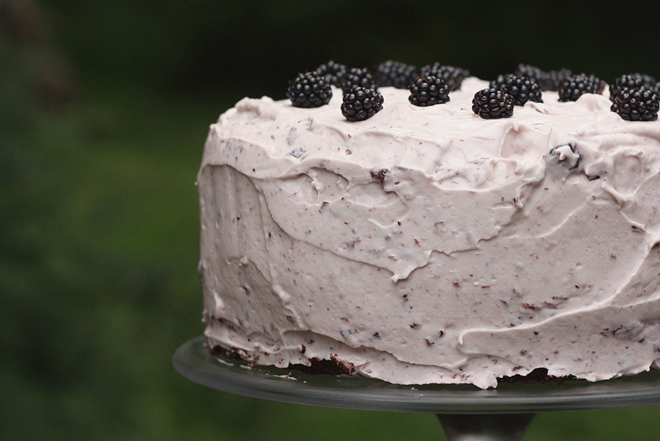 I made my standard whole wheat pastry flour chocolate cake, and while it was cooling, turned my thoughts to jazzing up a basic cream cheese frosting. There is almost always a berry component to Nadine’s birthday cake: wineberries are at their peak each year right around her birthday and I’ve often incorporated them into the flavor and design. But spending a couple of hours battling the thorny wineberry bushes in our neighborhood wasn’t satisfying my requirement for “simple & easy” this year. Popping open a jar jam and mixing it into a simple cream cheese frosting seemed more my speed: since purple is Nadine’s favorite color, she is a chile head like me, and blueberries are one of her favorite fruits, blueberry, lemon & chile jam fit the bill nicely. A few blackberries plucked off of the wild backyard canes scattered over the top et, voila! Cake decorating in minutes: Berry Edition.