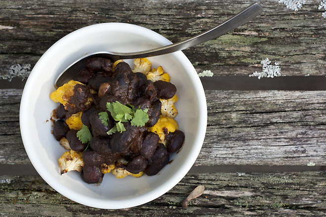 Ayocote negro beans from Rancho Gordo’s Xoxoc project are a beautiful, silky black runner bean, large and meaty, and like many heirloom varieities, have a taste that’s subtly different from your every day runner bean. They are grown on small farms in the Mexican state of Puebla under the Xoxoc Project, which helps farmers in Mexico find a market for indigenous bean varieties that have fallen out of favor both at home and abroad. As much as I love eating locally and do my best to support my local foodshed, I also love projects like this: one small farm helping another small farm to keep ancient plants & foods alive and viable. It connects us across cultures and across the ages, and, as it happens, makes a damn fine bowl of beans. Served over nicely roasted cauliflower, this dish is hearty enough for a full meal, or you could make it a side dish and round out the meal with a salad, grilled sausages, or some roasted chicken.