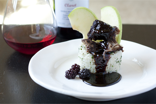 Berry-Braised Beef with Herbed Chèvre Rice & Blackberry Reduction
