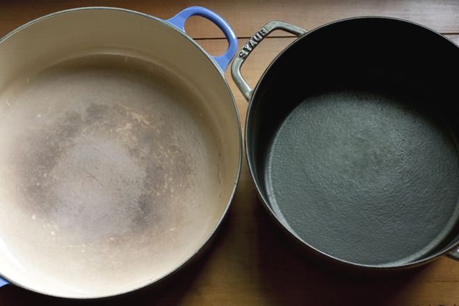 It may not be fair to compare the two pots, however: Big Blue gets used much more often, and under high-heat and heavy-stirring conditions. The Staub I use probably 3 – 4 times a month, mainly for low- to medium-heat applications like cooking beans or braising meat. The Le Cruest is my workhorse, especially in the summer, and it shows: the Staub has it easy in comparison.