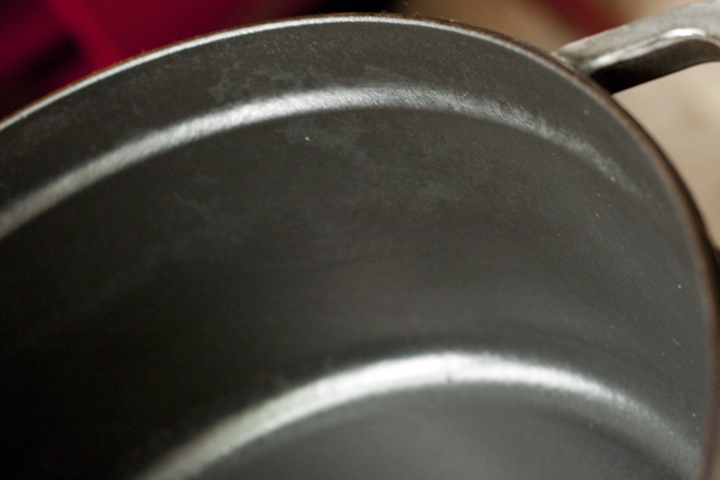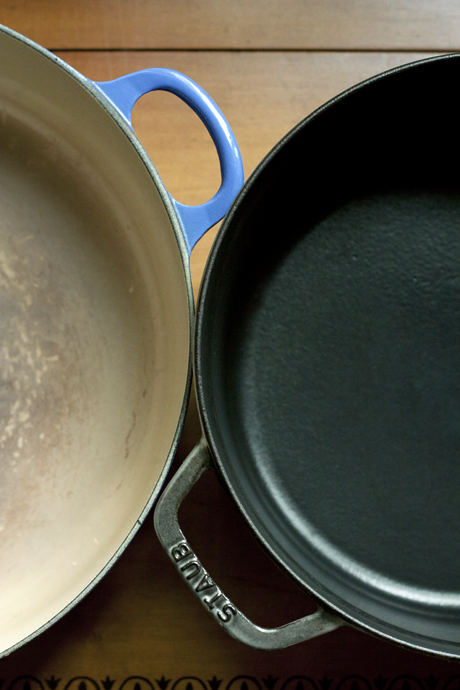 One thing I have found is that the Staub can be frustrating to clean: because of the black and textured surface, when wet, everything looks spanky & clean, and once the water starts to evaporate, you find lines along the sides or edges where you need to scrub again. Also, the Staub may be even more persnickety in the taking-care-of department: if you do not dry the interior right away, it can develop a whitish film in spots (just visible along the rim below). It doesn’t appear to affect performance, and it disappears instantly if you apply a little oil, but still: alarming the first couple of times you see it. I generally wipe the interior of the Staub down with a bit of flaxseed or walnut oil after washing, which keeps the interior shiny & black (the photographs here are post-cleaning but without any oil) and seems to have improved the non-stick surface over time.