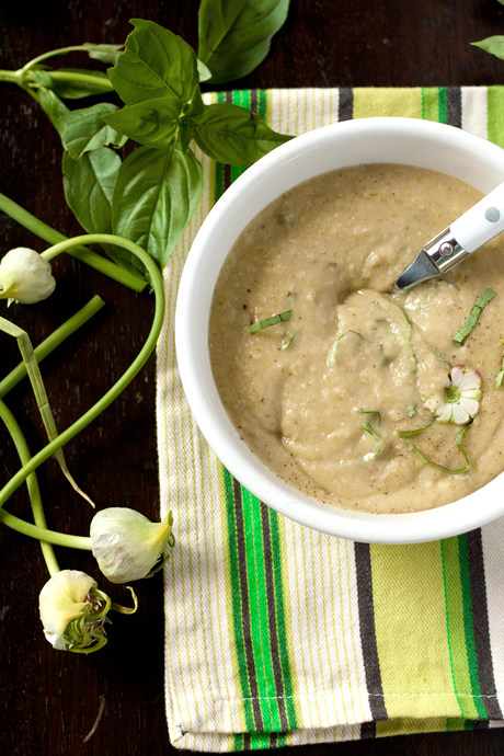 It’s hot. So it would seem that a hearty, garlicky, potato + white bean soup is just the ticket, no? I didn’t think so either, and in fact, I made this soup simply to use up the two big bunches of garlic scapes that were in the fridge, anticipating yet another bunch in this week’s CSA. I thought I would simply make the soup and freeze it, assuming that a thick-n-hearty soup was not the thing to offset my popsicle-and-popsicle diet of the last few days. But, you see, I was wrong: turns out this soup is just the ticket.