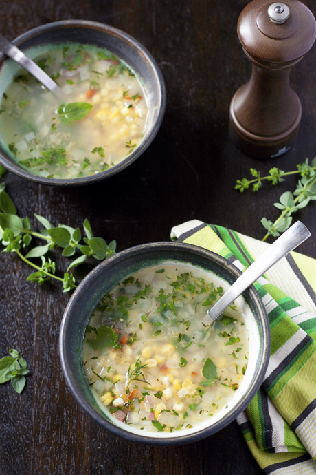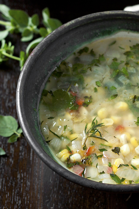 3. A lot of different fresh herbs could work nicely here. I chose oregano and summer savory, but tarragon goes very nicely with corn; cilantro and oregano could give it a Mexican spin, while thyme and rosemary are always nice. You could go very simple with just some snipped chives, cooling with fresh mint, or Italian with fresh basil and a few halved cherry tomatoes tossed in at the end. It’s easy to take this soup in any direction you fancy.