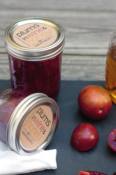 The last week in particular has seen my canner in almost constant bubble: peach butter, pirate peaches, peach jam with tequila & chile, tomato chutney, fire roasted tomatoes and the endless pickled eggplant; I labeled and stored about 4 dozen jars yesterday. The easiest by far of the recent spate of preserving, however, has been this one: plums in wine & honey.