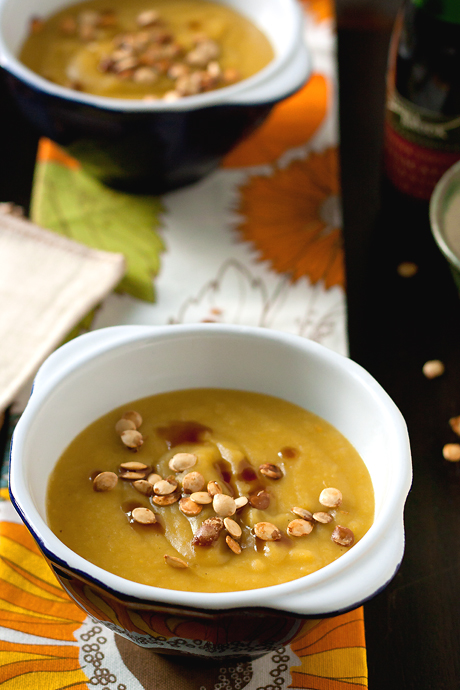 As fresh herbs seemed de trop alongside the gently floral flavor of delicata, I opted to dress up the soup with some roasted squash seeds (You know that you can roast the seeds of any winter squash, right? Just keep an eye on the smaller seed varieties, as they toast quickly and will burn if left in too long.). And what better opportunity to use a drizzle or two of my local delicata squash seed oil from Stony Brook in upstate New York? None, I say: none.