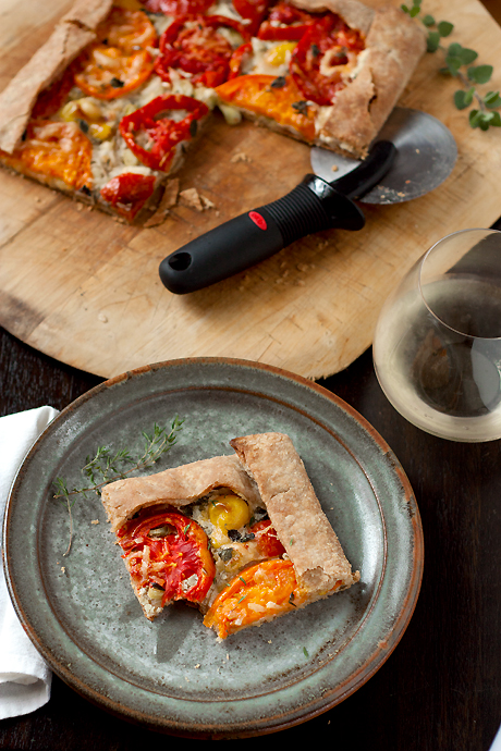 The oh-so flaky and whole-wheat nutty pastry dough comes together in a snap with a grated stick of frozen butter and an egg taking place of some of the water in the dough (An egg! Who knew?). I like the rustic & easy fold-over technique, but you can easily fit the dough into a tart pan, or even just bake it flat on a pizza stone if you like: it’s quite adaptable and very forgiving as pastry goes. The  tangy goat cheese, the spicy, late-summer herbs, the rich olive oil, the cracked black pepper: they all work as a perfect foil for the leeks, the fat heirloom tomatoes and just a touch of Gruyère. I made the version above just a few hours ago and it’s gone, gone, gone: it disappeared so quickly that I’m determined to bring home more tomatoes from the market this weekend. And I’ll keep on making this tart until the tomatoes are gone, gone, gone for another year.