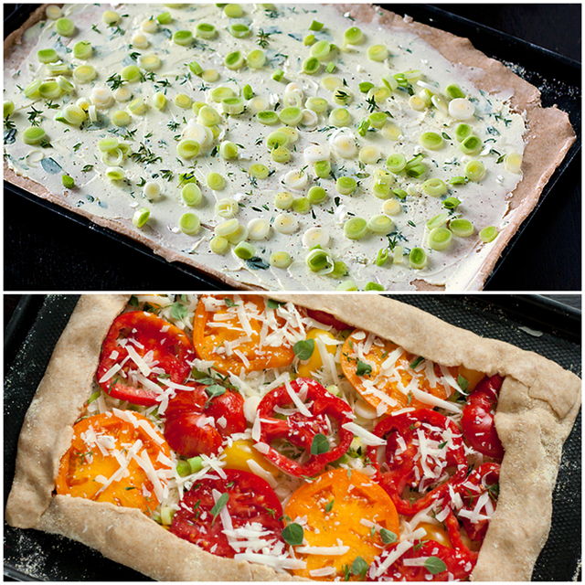 3. Pat the dough into a rectangular shape, about the size of a business letter. Roll out to approximately 1/4-inch thickness, rolling from the middle and loosening the dough from the board, and adding additional flour as needed. Sprinkle corn meal liberally on a baking sheet. Transfer the dough to the baking sheet. Spread the dough thinly & evenly with the chèvre mixture. Sprinkle on sliced leeks and about half of the Gruyère. Layer on sliced tomatoes, keeping about 1 inch clear on all sides. Top with the remaining Gruyère and fresh herbs and a grind or two of fresh black pepper. Fold the edges of the tart dough up, tucking some of the filling under the fold, and folding under any thin edges to form a smooth edge.